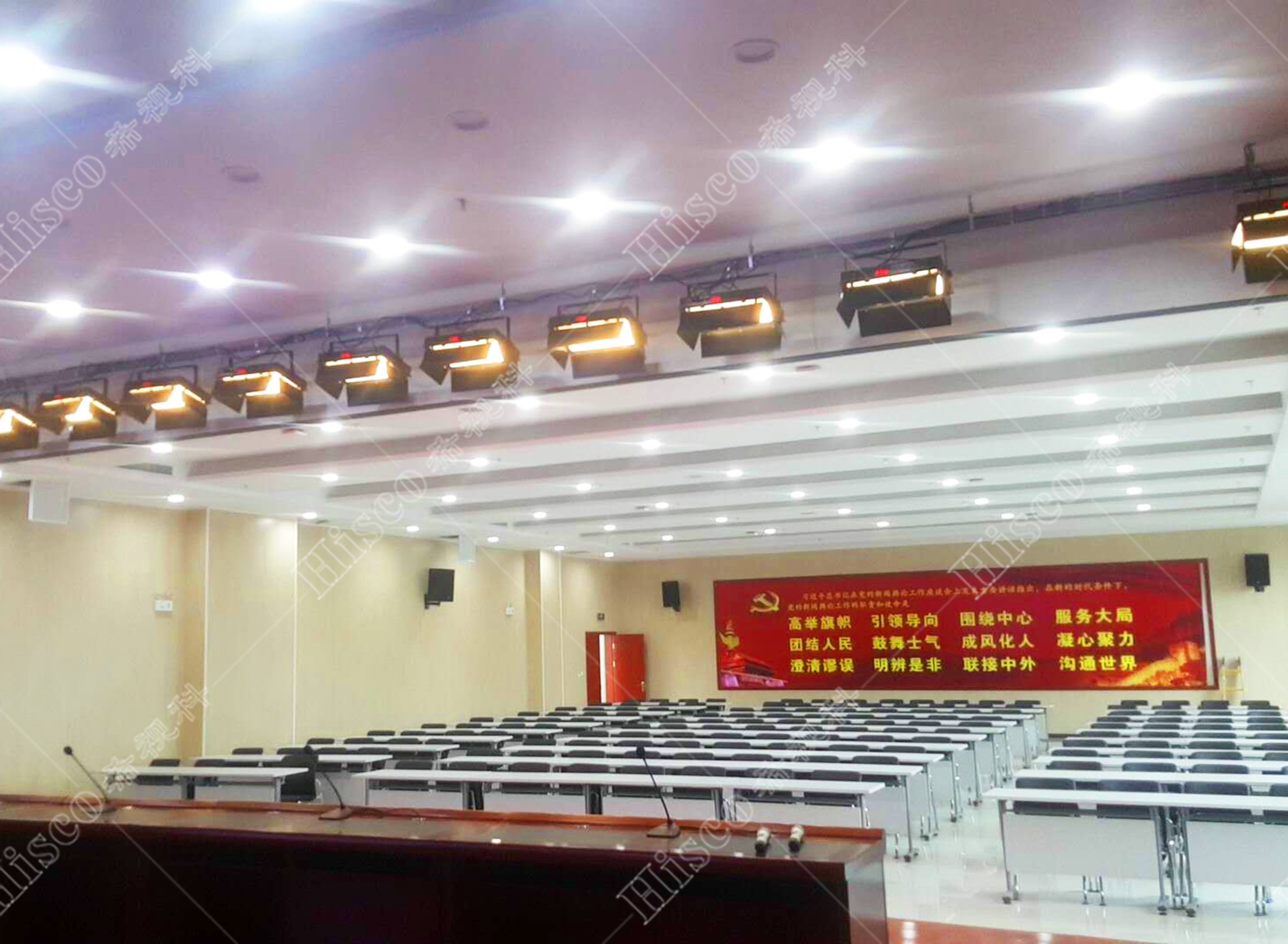 会议室内需要需要做扩声系统、会议系统、显示系统,智能化系统;满足日常开会的讨论、发言等等。综合礼堂的设计,追求语言的清晰图和饱和度,声压级级要求达到国家厅堂扩声系统一级标准。同时预留了丰富的接口,方便以后系统的扩展,实现整个系统的强大功能。同时有演出用的舞台,配置了专业的舞台灯光系统和演出扩声系统,加了超低音音箱和效果器,追求声音的饱满度和浑厚感,能够满足文艺演出,会议报告,庆典活动召开等功能。