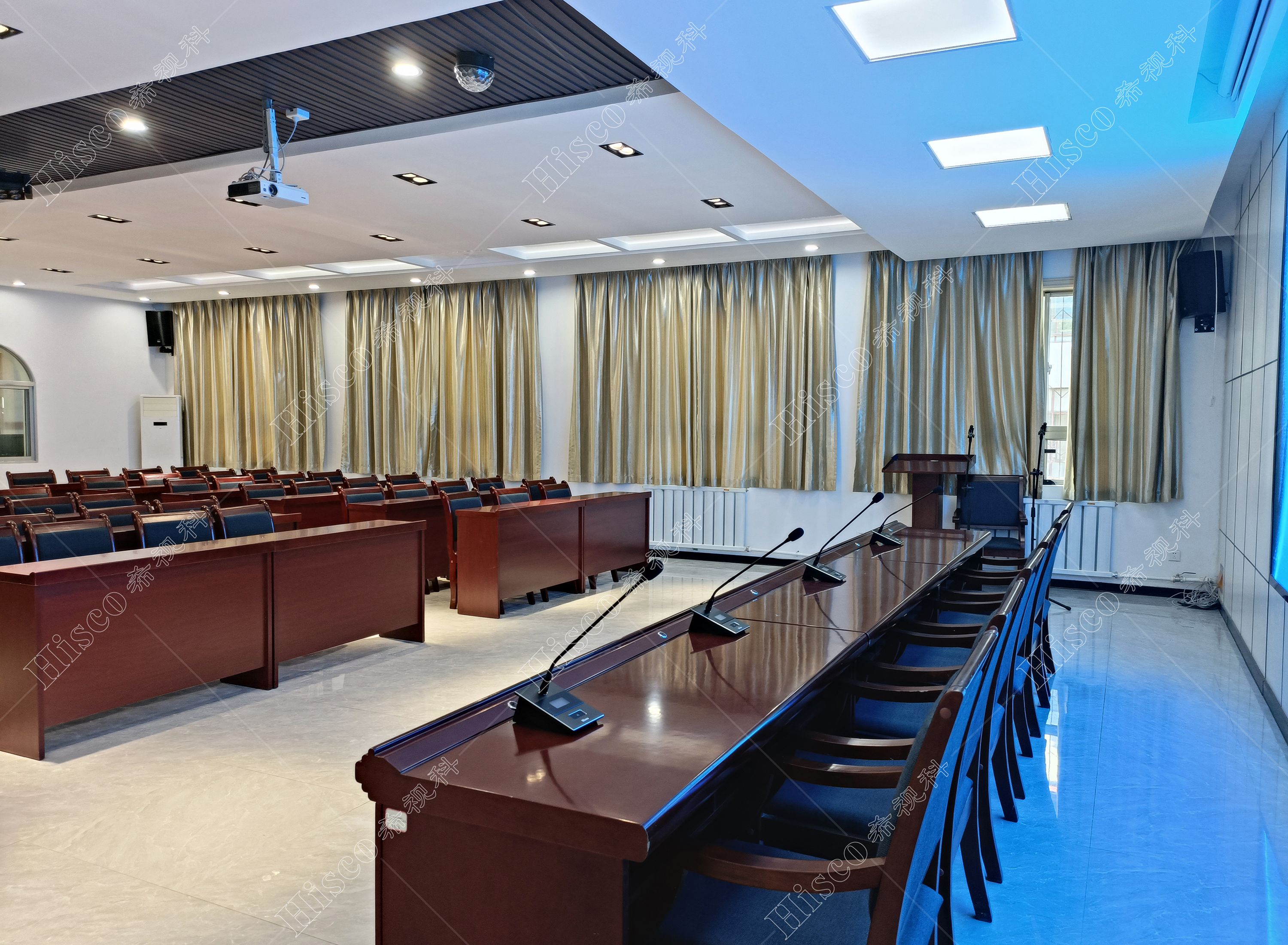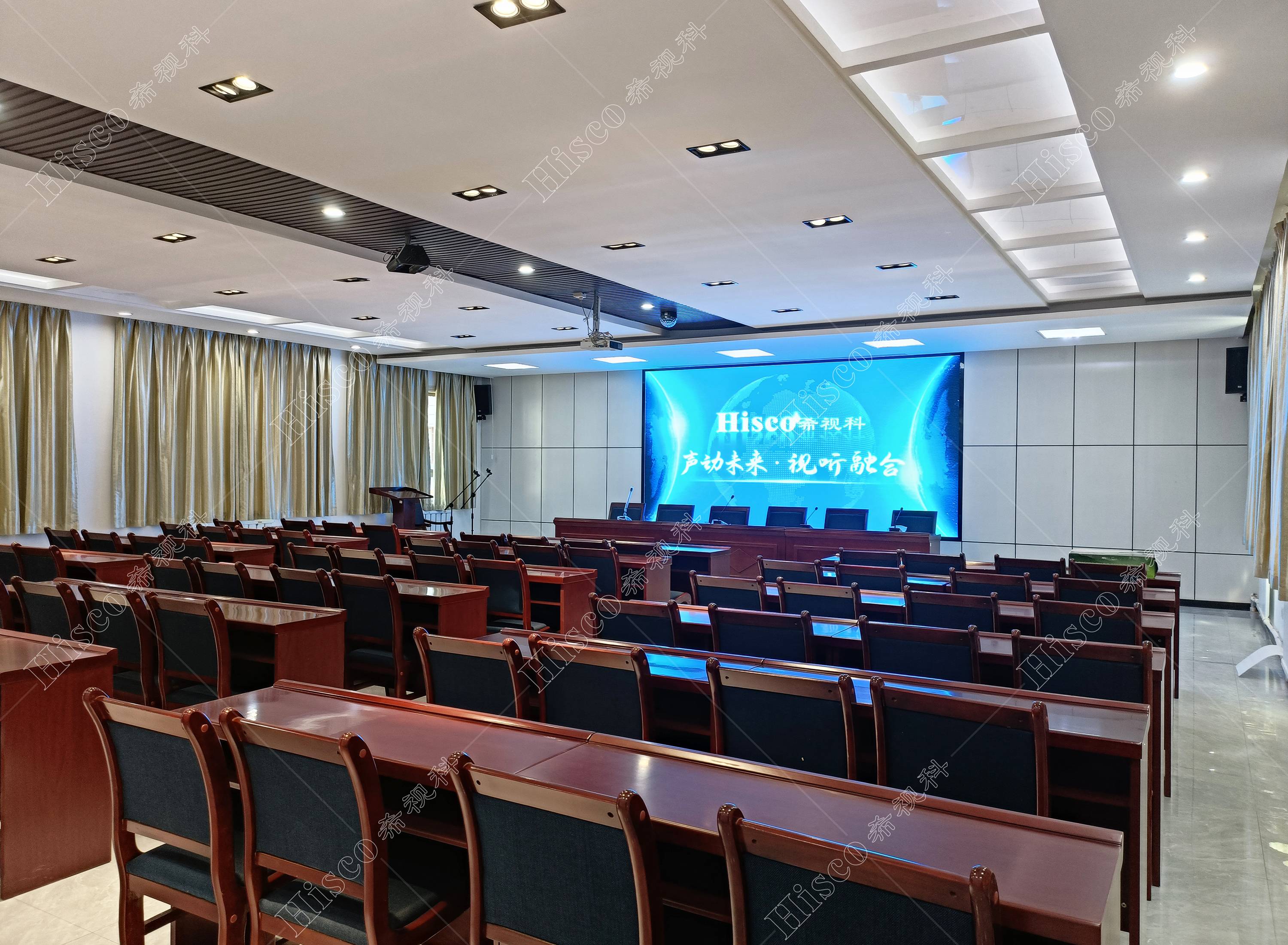 会议室内需要需要做扩声系统、会议系统、显示系统,智能化系统;满足日常开会的讨论、发言等等。综合礼堂的设计,追求语言的清晰图和饱和度,声压级级要求达到国家厅堂扩声系统一级标准。同时预留了丰富的接口,方便以后系统的扩展,实现整个系统的强大功能。同时有演出用的舞台,配置了专业的舞台灯光系统和演出扩声系统,加了超低音音箱和效果器,追求声音的饱满度和浑厚感,能够满足文艺演出,会议报告,庆典活动召开等功能。